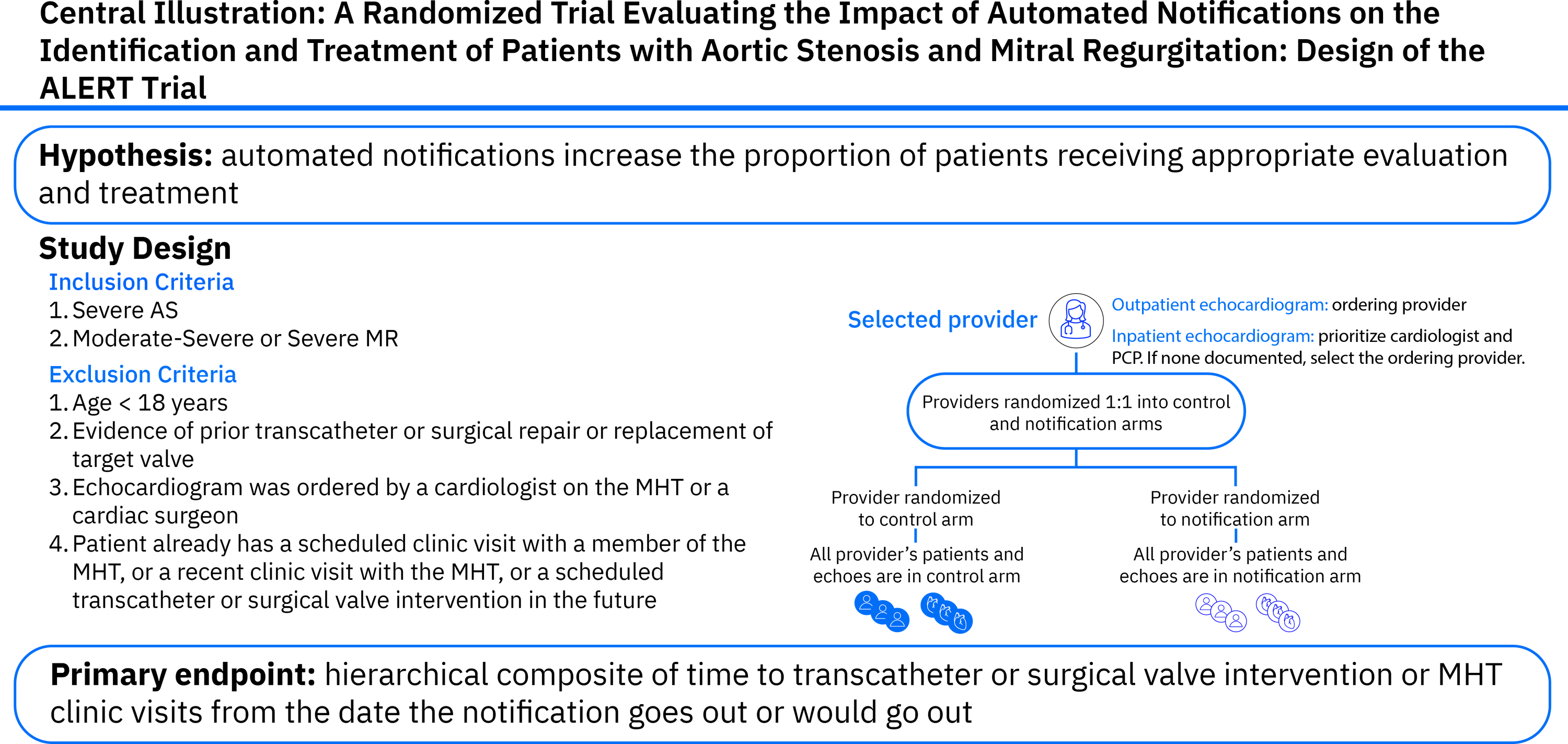 As of August 2025, enrollment has ended, with 2006 patients and 741 providers enrolled across participating sites. The trial is powered to greater than 80% at a total sample size of 1,246 patients or greater, based on the assumption that alerts will result in an absolute increase the incidence of valve intervention and MHT referral of 5% within 90 days (which entails hazard ratios between 1.5 and 2.05). Prespecified subgroup analyses will assess the impact of the intervention on healthcare disparities, including race, sex, and site.