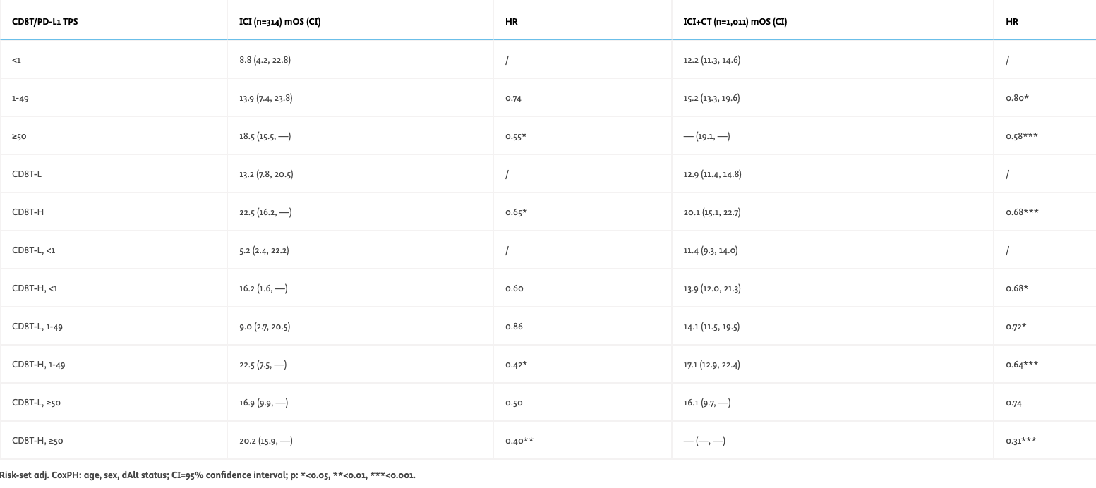 Results – After 1L-ICI+CT, PD-L1 and CD8T were associated with improved mOS in mNSCLC; CD8T further stratified OS within PD-L1 groups and between 1L-ICI+CT (Table). In eNSCLC and mNSCLC, CD8T and PD-L1 were highest in cases with no dAlts and KRAS dAlts, and lowest in the c/ncEGFR dAlt cohorts (p<0.001). CD8T-H/PD-L1≥1 and CD8T-H/PD-L1≥50 were most frequent in the non-dAlt and KRAS groups (p<0.001), while CD8T-H/PDL1≥50% was least common and CD8T-L/PD-L1<1 was most frequent in the c/ncEGFR dAlt cohort (p<0.001).