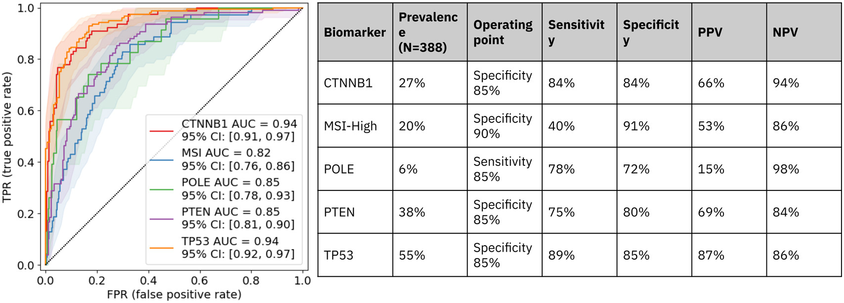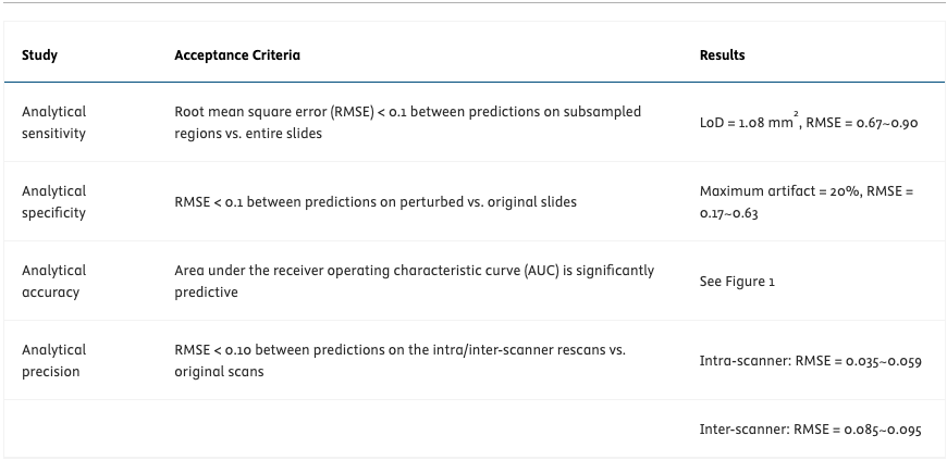Fig. 1 shows the validation cohort sample count, the model’s AUC, and performance metrics at a predetermined operating point for each biomarker. Table 1 summarizes key results from the LDT validation. The model achieved significantly predictive AUCs for all biomarkers and improved performance compared to previous studies. The discrepancies between model predictions on the original scans vs on inter/intra-scanner rescans satisfied RMSE<0.1 for all biomarkers. The model demonstrated a LoD of 1.08 mm2 tissue and robustness to 20% blur or color artifacts.