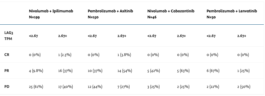 Background – LAG3 is an immune checkpoint receptor that has gained interest as a response biomarker and treatment target. However, its relationship with outcomes in RCC is poorly characterized. This study evaluates LAG3 gene expression and its association with outcomes.