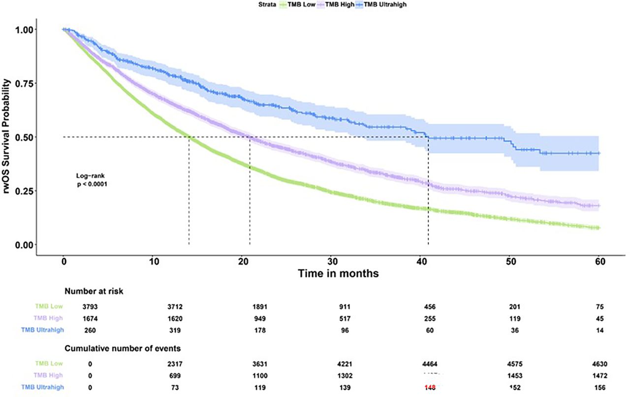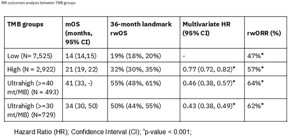 Results – Demographic characteristics including age and sex were similar between groups. Among the ultrahigh group, 266 (49%) had GI cancer, 82 (15%) had lung cancer, 117 (21%) had melanoma, 38 (7%) had NMSC, and 43 (8%) had uterine cancer. rwORR was significantly higher in the ultrahigh group compared to the high and low groups (p<0.001) (table 1). This trend was more pronounced in melanoma, lung, and GI cancers compared with NMSC and uterine cancer. rwOS was significantly improved in pts in the ultrahigh and high TMB groups compared to the low group (HR 0.38, 0.69, p<0.001) (figure 1). Results remained significant when adjusting for cancer type, MSI status, stage, age, and sex (table 1). Similar results were seen using a 30 mt/MB cutoff. Immune cell infiltration was higher in the ultrahigh TMB group for CD8, regulatory T-cells, M1 macrophages, and neutrophils, and lower for B cells and M2 macrophages (p<0.001). Most gene mutations were more common in ultrahigh TMB samples except TP53, KRAS, and MTAP.